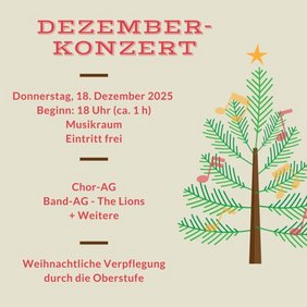 Am Donnerstag, 18. Dezember 2025, lädt unsere Schule herzlich zum traditionellen Dezember-Konzert ein. Beginn ist um 18:00 Uhr im Musikraum – der Eintritt ist frei. Freuen Sie sich auf Beiträge der Chor-AG, der Band-AG „The Lions“ und weitere musikalische Beiträge. Die Schülerinnen und Schüler der Oberstufe verwöhnen Sie mit weihnachtlicher Verpflegung.