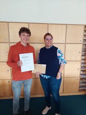 Letzte Woche fanden im Lehrerzimmer Ehrungen für verschiedene Schüler statt. Nicolas Bell, 10a, wurde für seinen ersten Preis der Stiftung für politische Bildung im Bereich Kurzgeschichte die Urkunde von Frau Horn überreicht, Herr Dr. Brand gratulierte Luca Huchler, 9c, zur bestandenen Fußball-Mentoren-Ausbildung und Herr Gretler berichtete über die erfolgreiche Teilnahme von Daniel Kuhn und Tobias Oehler, 10b, bei den deutschen Meisterschaften der Robotics.