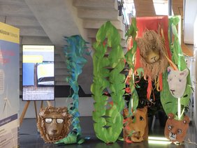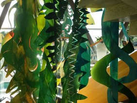 Die Klasse 6b hat im Kunstunterricht aus großen Tapetenrollen einen Urwald gestaltet, der nun im Rahmen der Gartenschau in Balingen zu sehen ist. Zusammen mit den Löwen aus der Kunst-AG und verrückten Vögeln der Geschwister-Scholl-Schule in Tübingen bildet er noch bis zum 9.7. den Rahmen für die Ausstellung unseres Regierungspräsidiums im Foyer der Stadthalle Balingen. Die feierliche Eröffnung am 28.6. war einen Ausflug wert. Danke an die fleißigen Künstler und Künstlerinnen, die auf diese Weise unsere Schule so wirkungsvoll präsentieren.