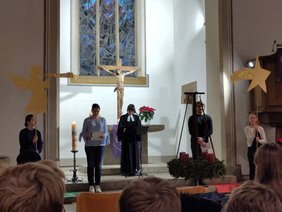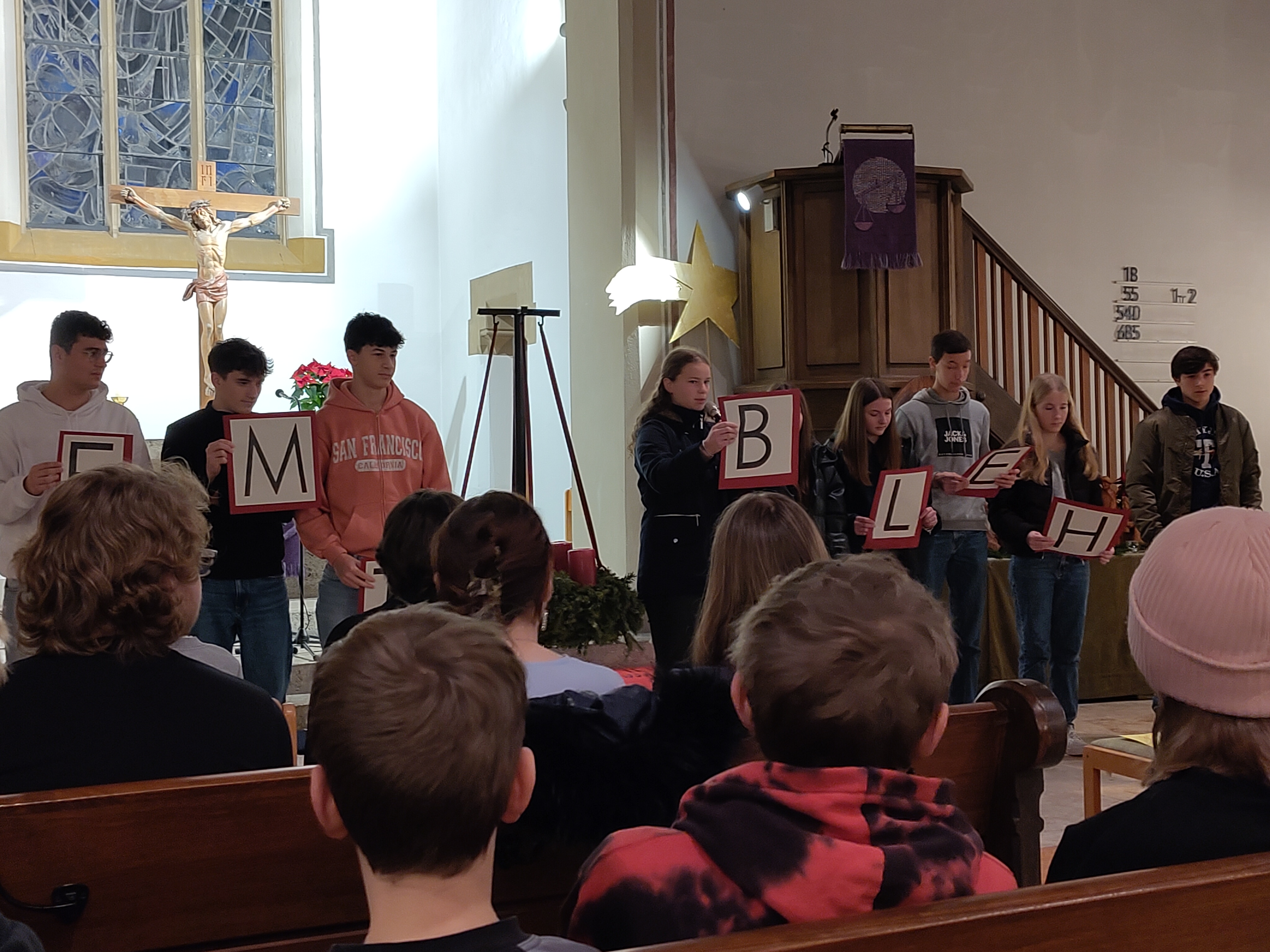 Am letzten Schultag fand ein Weihnachtsgottesdienst statt. Thema war "Bethlehem", die Stadt, die heute so Schwierigkeiten hat mit der politischen Lage- die aber damals ein gewissermaßen magischer Ort war. Vielen Dank dem Vorbereitungsteam um Frau Rauch, an Pastorin Vogt-Günzler, an Frau Dippon für die künstlerische Gestaltung, dem Mesner der evangelischen Stadtkirche für das vorzeitige Aufstellen des Christbaums, dem Organisten und last but not least, den vereinigten, neu gegründeten Chören, die den Gottesdienst musikalisch mitgestaltet haben... und natürlich allen, die mitgefeiert haben!