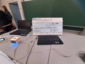 Die VR-Bank Ravensburg-Weingarten würdigte mit dieser hohen Summe das außerordentliche Engagement des Gymnasium Weingarten im Bereich Technik und Digitalisierung - vor allem in deren praktischen Anwendung. Unterstützt wurden das Fach NWT (Naturwissenschaft und Technik), die Technik-AG der Klassen 5-8, sowie die Robotics-AG für die besonders begabten, älteren Schüler. In Anwesenheit des designierten Oberbürgermeisters Clemens Moll und des Abteilungsleiters für Gesellschaft, Bildung und Soziales, Rainer Beck, überbrachte Vorstand Arnold Miller von der VR-Bank Ravensburg-Weingarten den symbolischen Scheck dem Gymnasium Weingarten. Symbolisch deshalb, denn das Geld wurde in den letzten Monaten schon in Verschiedenes investiert: neue Roboter, Baukästen mit Lichtschranken, Sensorentechnik für die Großen und vor allem auch in den neuen 3D-Drucker und die CNC-Fräse.