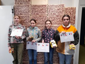 Félicitations! Kiara Alf aus der Klasse 7c gewinnt den Schulentscheid des Vorlesewettbewerbs Französisch. Nach einem klasseninternen Vorentscheid sind die Siegerinnen angetreten, um vor großem Publikum und einer Jury aus Lehrkräften und Schülerinnen der Jahrgangsstufe 10 die Schulsiegerin des Gymnasiums Weingarten zu küren. In der ersten Runde trugen Kiara Alf, Rebekka Weiß, Leni Minsch und Tuana Sadiku einen frei gewählten Text vor. In der zweiten Runde zeigten die vier Schülerinnen beim Vorlesen von unbekannten Textabschnitten aus der Lektüre "Les petites d'histoires d'Amandine", dass sie alle vier nach 1,5 Jahren Französisch-Unterricht schon richtige Profis in der zweiten Fremdsprache geworden sind. Das Gymnasium Weingartenn gratuliert herzlich und wünscht Kiara Alf für den Regionalentscheid in Wangen am 7. März "bonne chance"!