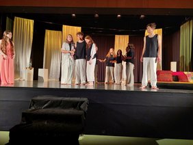 In Troja angekommen, scheinen die Charaktere gewachsen zu sein. Aus der hochemotionalen Helena wurde eine junge Frau, die sich des gesellschaftlichen Einflusses bewusst ist. Diese schwer zu spielende Veränderung wurde durch Körpersprache und Stimme von Marialouisa Crincoli so gut herausgearbeitet, dass man in den Zuschauerreihen das Gefühl hatte, dass sie wirklich durch eine abenteuerliche Seereise gereift ist. Auch Paris hat sich verändert. Obwohl er sich weigert, sich von der Gesellschaft instrumentalisieren zu lassen, entlarvt er, dass die hehren Ziele bei allen Kriegen nur vorgeschoben sind. Auch er ist erwachsen geworden. Diese Veränderungen auf die Bühne zu bringen und für alle erlebbar zu machen, zeichnet die Inszenierung der Theater-AG des Gymnasiums Weingarten aus. Die Reise von Sparta nach Troja ist aber nicht nur eine Reise über das Meer, sondern auch eine Reise in eine andere Welt. Wo in Sparta strenge Regeln herrschten, die man an strengen Frisuren, der kontrollierten Körpersprache und der strengen Choreographie mehr spürte als sah, herrschen in Troja freiere und vor allem emotionalere Regeln. Hier stehen Gefühle im Vordergrund, gute und schlechte. Die Sehnsucht nach ihrem Garten spielte Katrin Neugebauer sehr pointiert. Aber auch die Ausgrenzung von Helena brachten Medina Qullumi, Rebecca Martini und Maya Rehm gelungen zum Ausdruck. Cassandra, die unverstandene Seherin, versetzt die Zuschauer durch ihr Auftreten in eine Mischung aus Respekt und Furcht. Die Bühnenpräsenz von Deborah Youssef führt dazu, dass man das Gefühl hat, dass sie die wahre Kassandra ist. Die ganzen Ängste und die Verzweiflung der Figur werden durch ihr schauspielerisches Können greifbar und spürbar.