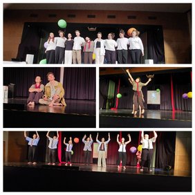 Der kleine Prinz kümmert sich liebevoll, aber auch leicht überfordert um die Rose. Isabella Rus gibt ihrer Rolle eine schöne Mischung aus Anspruchshaltung und Zartheit. Der Geschäftsmann will alles über Zahlen und Besitz kontrollieren. Maya Rehm spielt ihn laut mit überschnappender Stimme und hysterischem Lachen. Beim nächsten Planeten trifft der kleine Prinz auf den König. Dieses Treffen jagt ihm sichtbar Angst ein, denn der König präsentiert sich als machtbesessener Narzisst, bei dem Nicolas Bell mit furchterregendem Make-Up und diabolischem Lachen eine ganz andere Seite zeigen kann als bei seiner ersten Rolle als Pilot. Immer wieder wird das Stück aktualisiert: die ,,Eitle‘ wird hier als gestresste Influencerin gestaltet. Leni Minsch zeigt, wie nahe sich Perfektion und Angst vor dem entscheidenden Fehler sein können. Jona Rief bringt in seinen Rollen als Säufer und als Geograph das Publikum zum Lachen, so authentisch ist sein Spiel. Der Laternenanzünder muss ständig die Laternen an- und wieder ausmachen. Sarah Rief rennt von einer Seite der Bühne zur anderen und ist sichtlich genervt von den Fragen des kleinen Prinzen. Sie spielt auch die Schlange, die der kleine Prinz auf der Erde trifft, sie gibt der Schlange eine wundervolle Mischung aus Verführung und Gefahr.