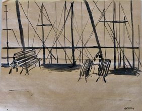 und ist ein altes Arbeitstier. Fast vierzig Jahre fährt sie schon die gleiche Strecke hin und her. Sie nimmt uns mit in ihren Takt. Am wohlsten fühlt sie sich in voller Fahrt, mitten auf dem See, zu beiden Flanken offene Flächen, Weiten, Horizonte. Sie zeichnet eine schnurgerade Linie in das Wasser, nur kurz vor den Ufern fährt sie einen leichten Bogen. In den Häfen erleichtert sie sich zuverlässig von allen Fahrzeugen und Fahrgästen. Sie ist ein Übergangsraum, sie schenkt Zwischenzeit. Nur wir bleiben sitzen, uns wird sie heute so schnell nicht wieder los. Indem wir bleiben, wenn alle aussteigen, werden wir ein Teil von ihr. Ihr dunkles Vibrieren, ihr leichtes Schwanken ist auch das unsere. Das Klacken der Brücke, wenn die Fahrzeuge hinaus oder herein fahren, die leeren Bänke, der Bistro-Kellner, der dann Zeit für ein Gespräch und eine Zigarette hat. Der stolz auf den nimmermüden Kahn ist, den er seinen Arbeitsplatz nennen darf. Unsere Blicke finden für kurze Zeit feste Ziele. Können wir sie auf Papier bannen, bevor sie sich wieder in Bewegung setzt? Unser Strich wird schnell. Und schon geht es wieder los, zum anderen Anfang. Nun ist das Wasser dunkel und der Himmel hell, vorhin war es umgekehrt – nicht eine Fahrt in gleichem Licht. Woran bleibt er hängen, unser Blick? An Farben, Strukturen, Formen oder Fluchten? An Nahem oder Fernem? Wolken, Wasser, Landstreifen, Menschen oder Segelbooten? Was wollen wir sehen, was sieht uns? Das Schiff jedenfalls sieht alles, tagein, tagaus und nimmt uns mit. Ein Grün, ein Grau, ein Blau – vorbei.