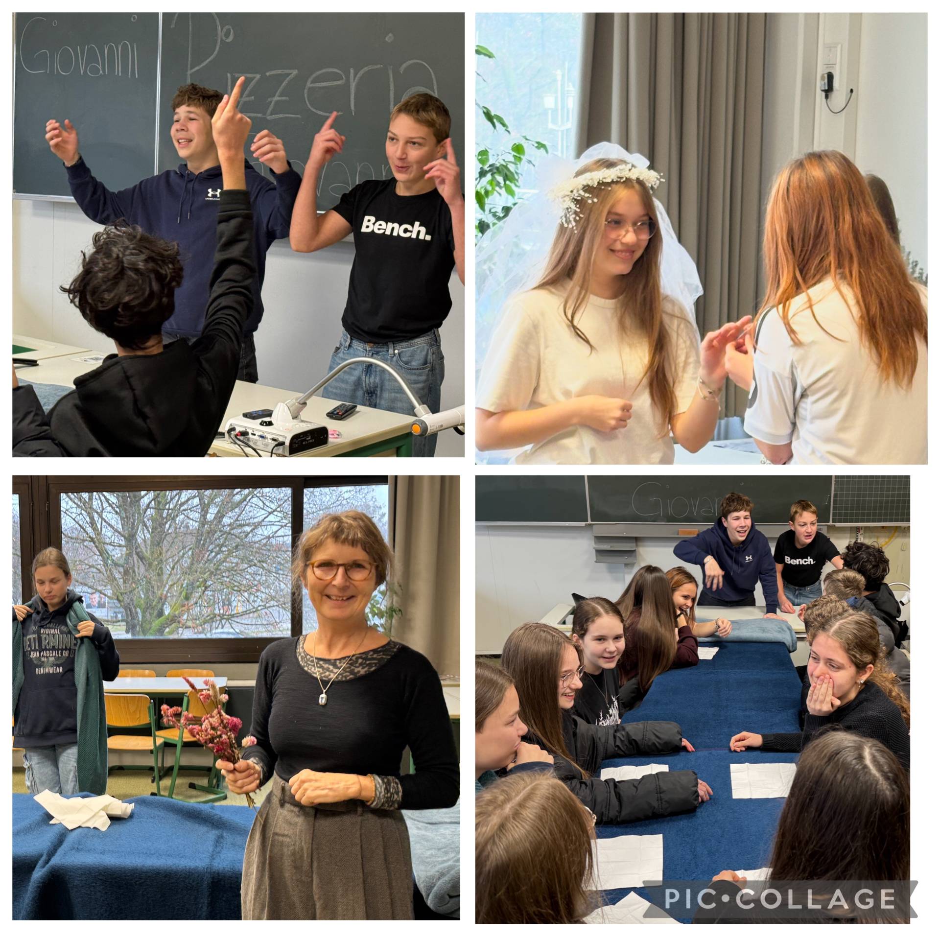 Die Einheiten begannen jeweils mit einem Warm-up aus originellen, lustigen Übungen, die dazu dienten, Hemmungen abzubauen und stimmlich wie körperlich auf die anschließende Arbeit vorzubereiten. Ausgehend von vorgegebenen Spielsituationen durften sie nun frei improvisieren. In einer der Klassen entstand dabei spontan die Figur des „Giovanni“ - ein Italiener, der zum Mittelpunkt des Spiels wurde und aus dessen Charakter sich sowohl humorvolle als auch tragische Szenen entwickelten. So zeigten die jungen Schauspieler:innen Giovanni in mehreren Rollen und Lebensphasen und hatten sichtlich Spaß daran, die unterschiedlichen Facetten seiner Persönlichkeit auf die Bühne zu bringen. Das gegenseitige Vorspielen der Episoden sorgte für viel Aufmerksamkeit, denn jede Gruppe war neugierig darauf, welche Ideen die anderen entwickelt hatten und wie diese umgesetzt wurden. Beeindruckend war, dass sich auch eher schüchterne und zurückhaltende Schüler:innen aktiv beteiligten. Denn nicht zuletzt trug die wertschätzende und offene Art der Theaterpädagoginnen dazu bei, sie zu motivieren und ihr Selbstvertrauen zu stärken.