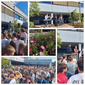 Es ist mittlerweile eine schöne Tradition: am ersten Schultag versammelt sich die Schulgemeinde, die Sonne scheint und die Band "The Lions" sorgt für gute Stimmung. Unser Schulleiter Dr. Brand begrüßte die Schüler*innen und dankte ihnen noch einmal für ihren Einsatz rund um den Festakt zum Jubiläum. Mit Blick auf den EM-Sieg am Vorabend der Basketball-Nationalmannschaft gab er den Jugendlichen Folgenes mit: "Im Team geht alles - außer Klassenarbeiten 😉". Auch der Schülersprecher Christian Feit und seine Stellvertreterin Liana Walter wünschten allen einen guten Start, viele tolle Erlebnisse und riefen dazu auf, sich zu engagieren: "Ihr habt hier so viele Möglichkeiten, mitzumachen!" In 3 Wochen wird dann der neue Schülersprecher - oder die neue Schülersprecherin gewählt, hoffentlich gibt es viele tolle Kandidat*innen!