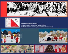 Viele Schüler*innen haben auch dieses Jahr tolle Kunstwerke erschaffen, dass die Auswahl für die Weihnachtskarte dieses Jahr richtig schwer viel. Schließlich hat sich die Schulleitung für Jason Bossharts (10c) Entwurf entschieden. Die Zeichnung zeigt eine stimmungsvolle Winterlandschaft in Schwarzweiss, in der die schwarzen und weißen Flächen gekonnt kombiniert wurden. Sie wird nun als Weihnachtsgruß unseres Gymnasiums verschickt werden. Zur Wahl standen neben der Winterlandschaft der 10c auch noch die fantasievolle Collagen „Der Weihnachtsmann feiert Geburtstag“ aus der 5a und „Winterfest in Unzlingen“ der 5b. Vielen Dank auch an Diana Marx für ihre tolle Zeichnung