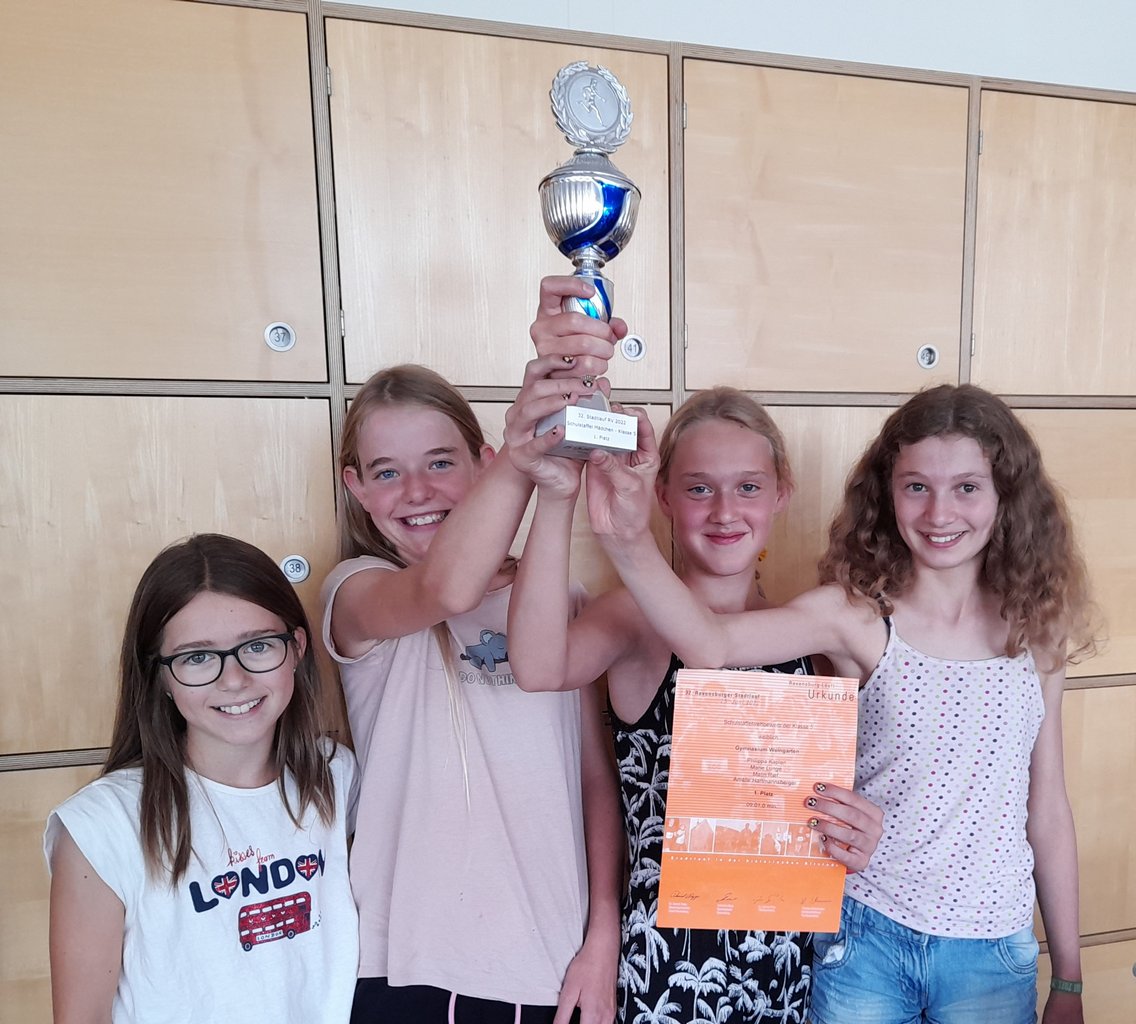 Das Bild zeigt die Mädchen der Klasse 5b, die in ihrer Altersklasse den ersten Platz belegten: Philippa Kaplan, Amélie Hartmannsberger, Malin Rief und Marie Lunge verwiesen in gut 9 Minuten die anderen Teams auf die Plätze. Gymnasium Weingarten wieder einmal "löwenstark" - auch in der Nachbarstadt Ravensburg!