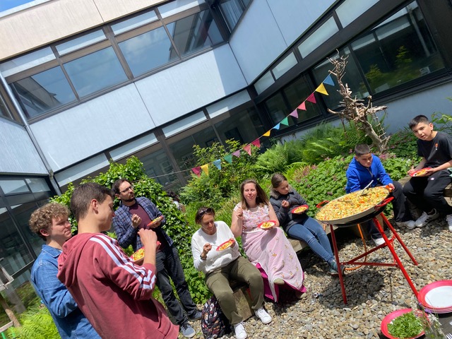 Die Innenhof AG hat heute in der Mittagspause mit einer kleinen Party den Frühling begrüßt. Alle Innenhöfe waren offen undman konnte die Sonne und das Miteinander genießen. Es gab Paella, verschiedene Drinks und Eis, wozu wir alle von unserem Preisgeld eingeladen haben. Es war so schön, dass wir es bald mal wiederholen möchten!