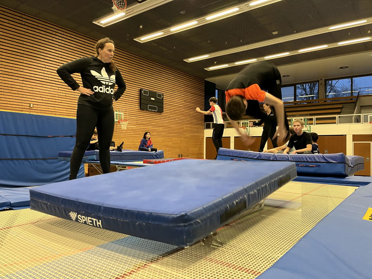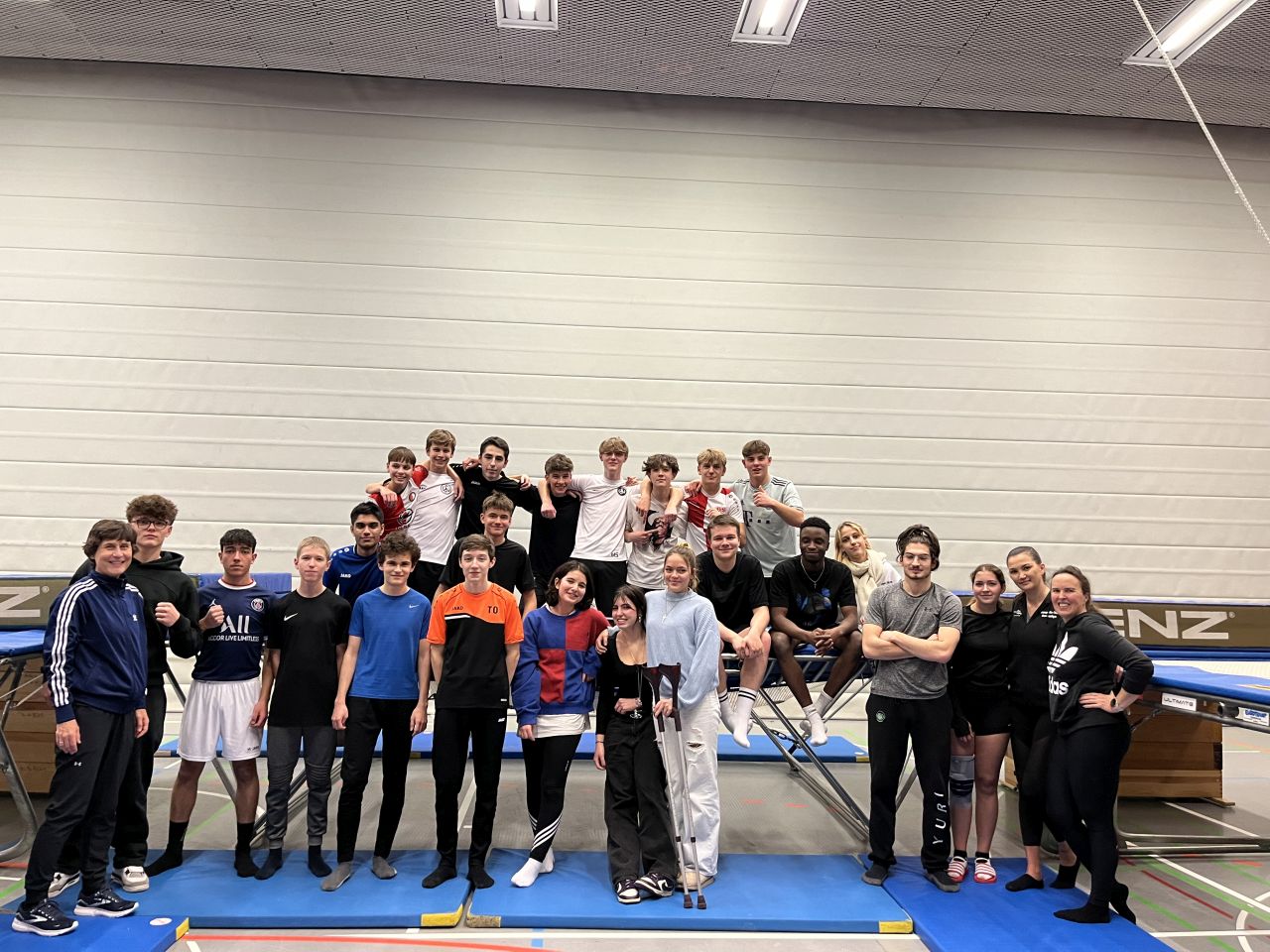 Am Donnerstag, 21.12.23 wird die Klasse 10b mit professioneller Hilfe der Trampolinabteilung des TV Weingartens in das Tramplinspringen eingeführt. Neben Spaß und spektakulären Flugerlebnissen spielte das Thema Sicherheit eine große Rolle. Die leuchtenden Augen aller Teilnehmenden verrieten die Begeisterung für die Grenzerfahrungen, die sie an diesem Nachmittag erleben durften. Ein gelungener Abschluss für das Jahr 2023!