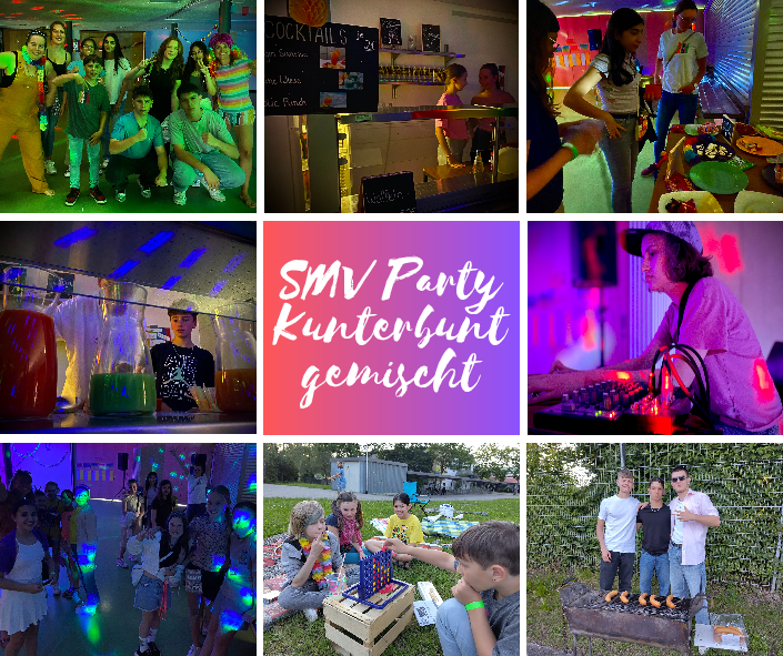 Unter dem Motto Kunterbunt gemischt fand am 7.6. unsere zweite SMV Party statt. Dieses Mal konnten die Schüler*innen im Foyer der Großsporthalle zur Musik von unseren DJs Emma (Kl 10) und Herr Baumann tanzen und Cocktails sowie Snacks genießen. Draußen wurde bei sommerlicher Abendstimmung von der Crew Christian (Kl 10) gegrillt und bei Outdoorspielen das Beisammensein genossen.