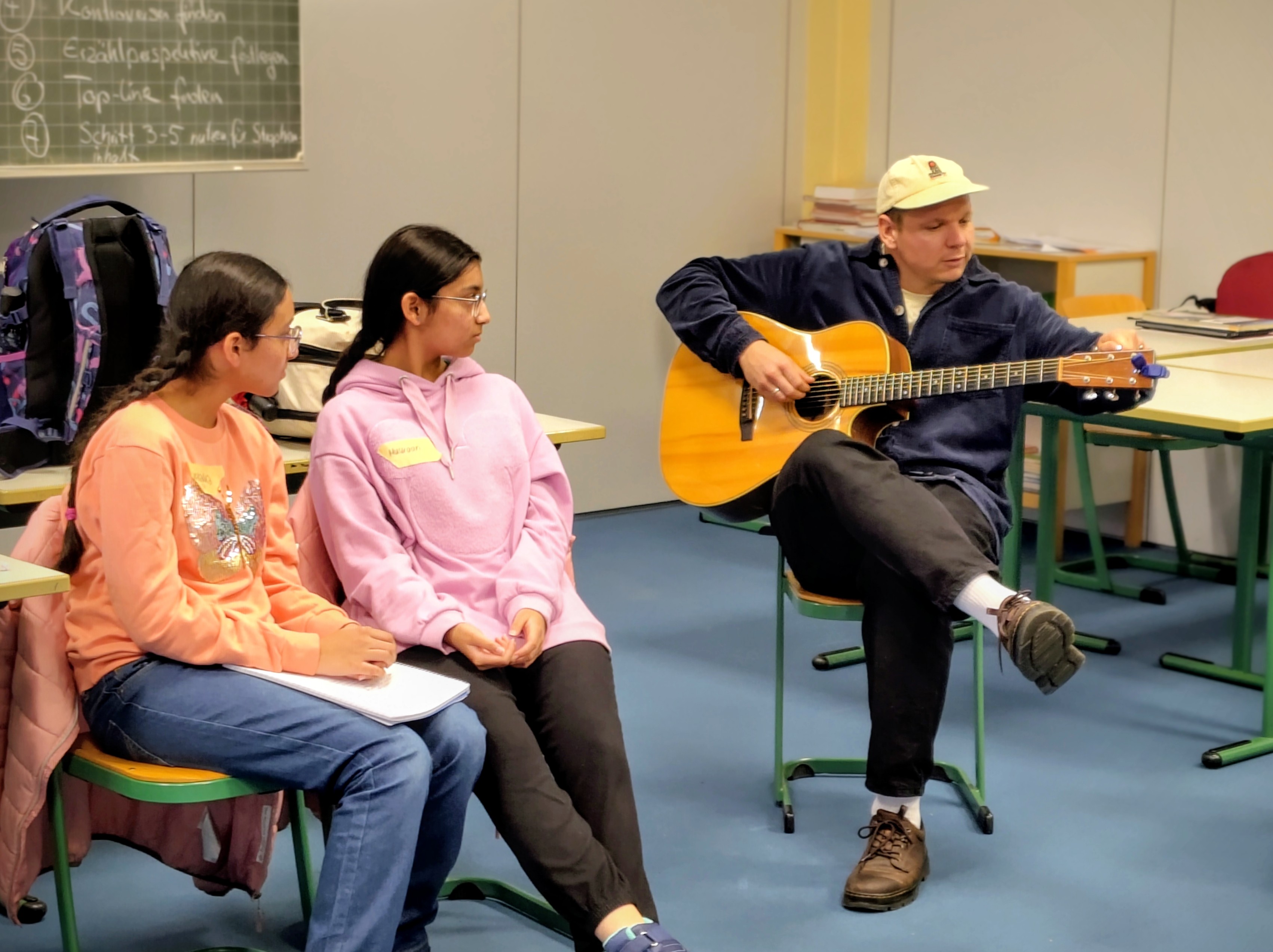Im Rahmen der Kinder- und Jugendliteraturtage war der Ravensburger Singer-Songwriter Peter Pux bei uns zu Gast und zeigte in einem Workshop den Schüler*innen der 10c mit seiner selbst entwickelten Methode, wie Songwriting funktioniert.