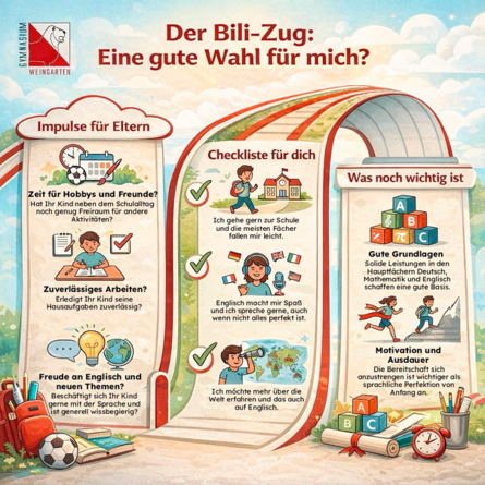 wir warten derzeit auf die Genehmigung des Kultusministeriums für die Einrichtung eines bilingualen Zuges ab dem Schuljahr 2026/27. Alle Anträge sind gestellt und so blicken wir zuversichtlich auf die Entscheidung für „Bili“ am Gymnasium Weingarten!